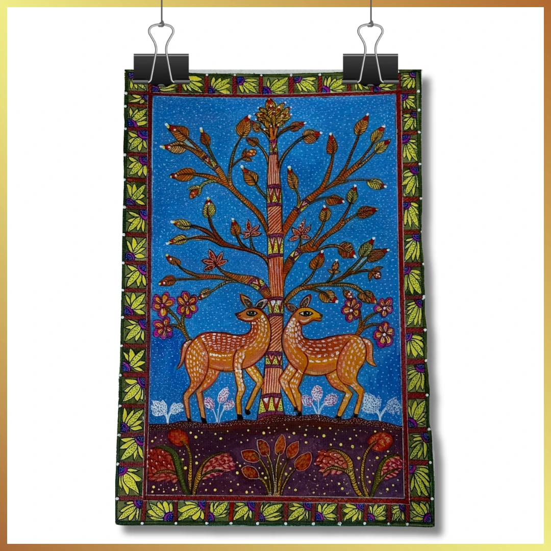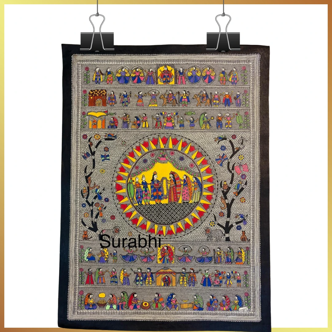 The composition reflects the harmony between the divine and material life, rooted in the rich symbolism of traditional Indian folk art.