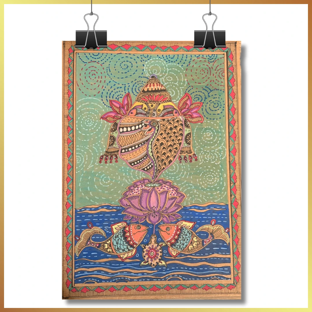 Acrylic pens on card sheet (20 × 30 cm), this Madhubani (Mithila) folk artwork features the conch, fish, and lotus, symbolizing spirituality, prosperity, and fertility.