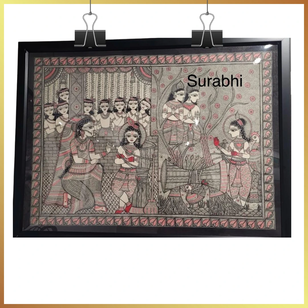 Size: 22 × 30 inches, this fusion artwork of Godna and Madhubani styles is created on handmade harshingar-treated paper using acrylic colours with nib and brushes.